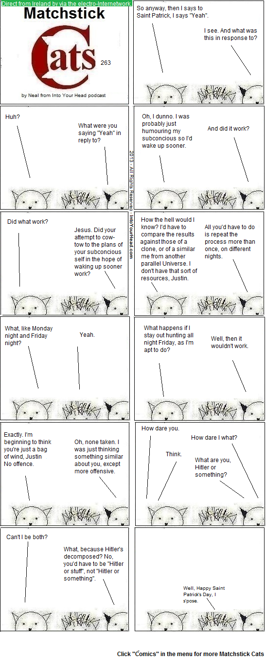 Vintage IYH – 669: Hair to a Alien 17 March 20137 June 2025 https://IntoYourHead.ie/show669.mp3Podcast: Play in new window | Download (Duration: 26:28 — 60.8MB)| Follow Podcast in Any App n a sub standard but nonetheless released episode, Neal discusses how to admonish your future self, the problem with digging, life without a mouth, a pope without cats, practicing science in the Garden of Eden, appreciating an extra head, doing science in your head and more. Share this post: Click to share on Bluesky (Opens in new window) Bluesky Click to share on Threads (Opens in new window) Threads Click to share on X (Opens in new window) X Click to share on Mastodon (Opens in new window) Mastodon Click to share on Facebook (Opens in new window) Facebook Click to share on LinkedIn (Opens in new window) LinkedIn Click to share on Tumblr (Opens in new window) Tumblr Click to share on Reddit (Opens in new window) Reddit Click to share on Pinterest (Opens in new window) Pinterest Click to share on WhatsApp (Opens in new window) WhatsApp Click to share on Pocket (Opens in new window) Pocket