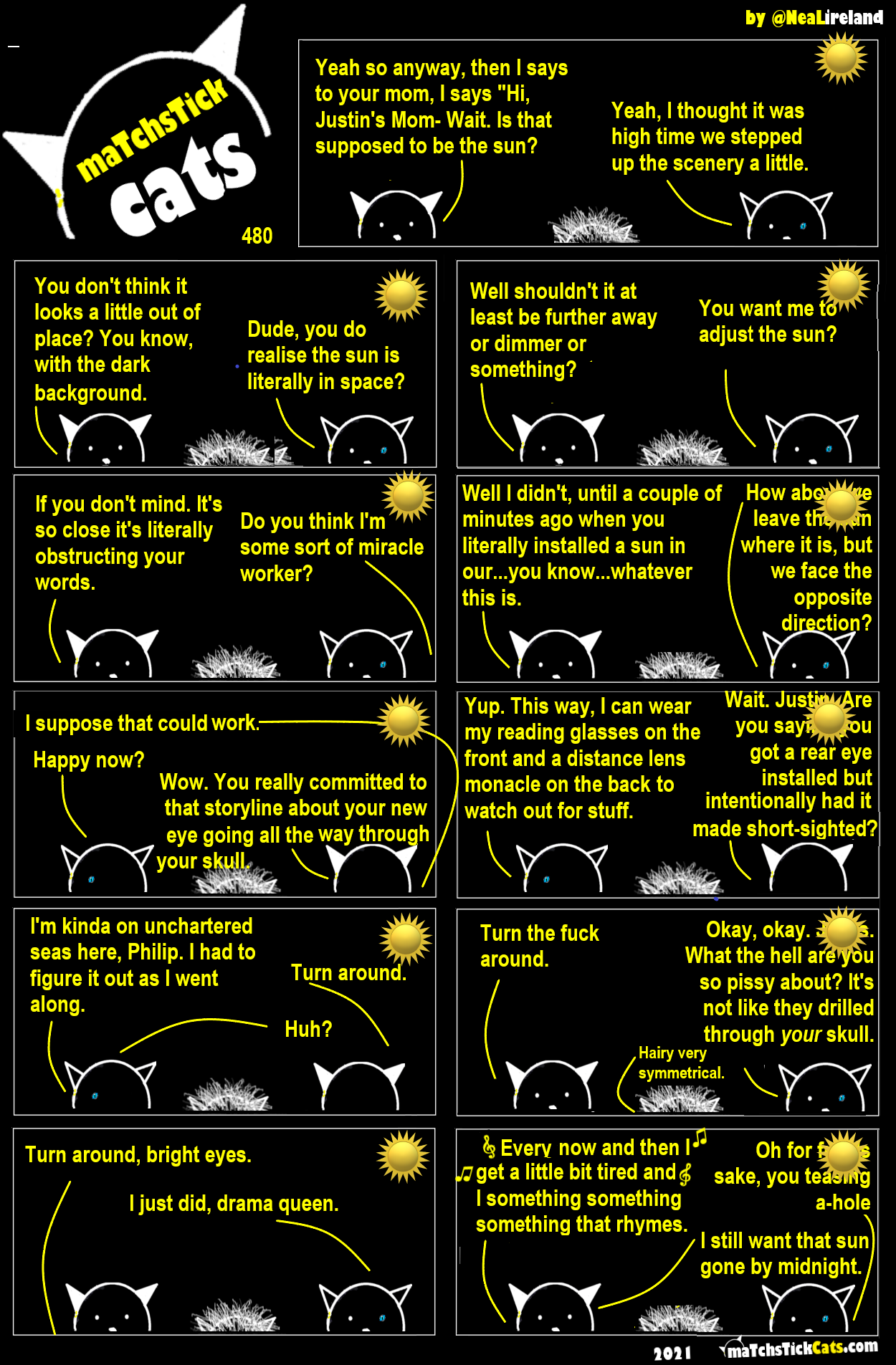 480: The Miracle of the Sun and the Third Eye 5 July 202120 February 2025 More Cats | All Episodes | Creative Commons | If you like swiping through comics in carousel form, try this page on Archive.org. < Share this post: Click to share on Bluesky (Opens in new window) Bluesky Click to share on Threads (Opens in new window) Threads Click to share on X (Opens in new window) X Click to share on Mastodon (Opens in new window) Mastodon Click to share on Facebook (Opens in new window) Facebook Click to share on LinkedIn (Opens in new window) LinkedIn Click to share on Tumblr (Opens in new window) Tumblr Click to share on Reddit (Opens in new window) Reddit Click to share on Pinterest (Opens in new window) Pinterest Click to share on WhatsApp (Opens in new window) WhatsApp Click to share on Pocket (Opens in new window) Pocket Related Catsegory w