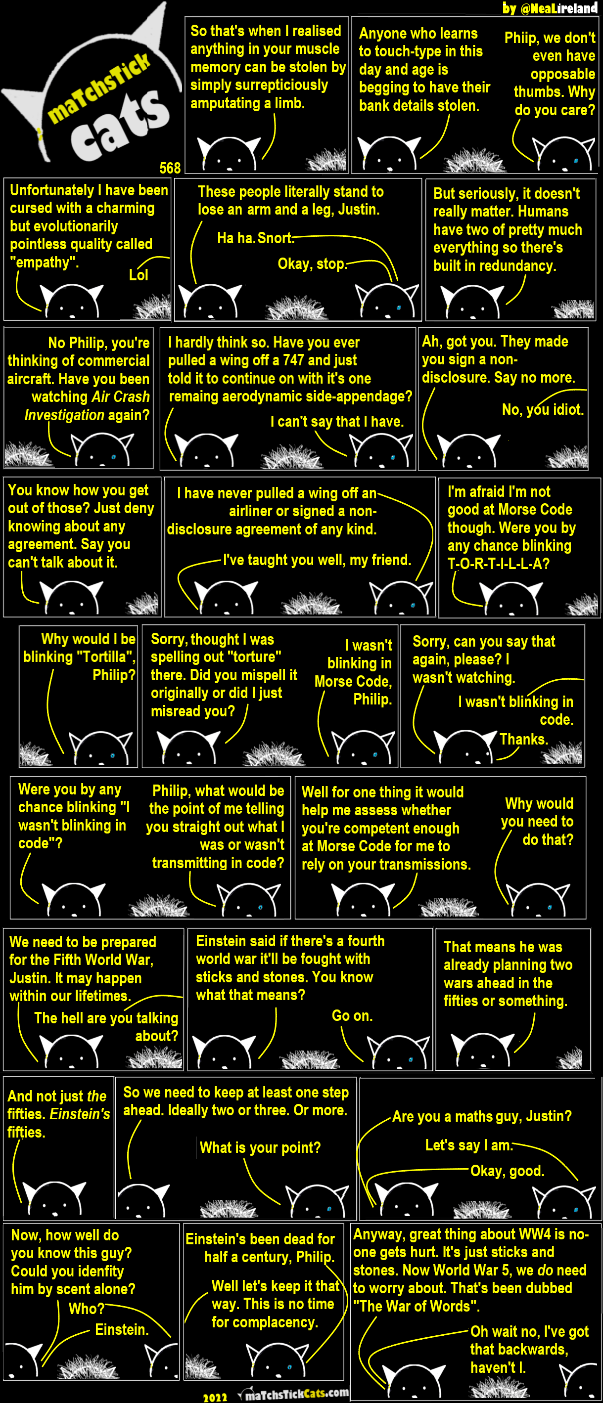 568: World Wars III through V 12 March 20224 September 2024 More Cats | All Episodes | Creative Commons | If you like swiping through comics in carousel form, try this page on Archive.org. < Share this post: Click to share on Bluesky (Opens in new window) Bluesky Click to share on Threads (Opens in new window) Threads Click to share on X (Opens in new window) X Click to share on Mastodon (Opens in new window) Mastodon Click to share on Facebook (Opens in new window) Facebook Click to share on LinkedIn (Opens in new window) LinkedIn Click to share on Tumblr (Opens in new window) Tumblr Click to share on Reddit (Opens in new window) Reddit Click to share on Pinterest (Opens in new window) Pinterest Click to share on WhatsApp (Opens in new window) WhatsApp Click to share on Pocket (Opens in new window) Pocket Related Catsegory
