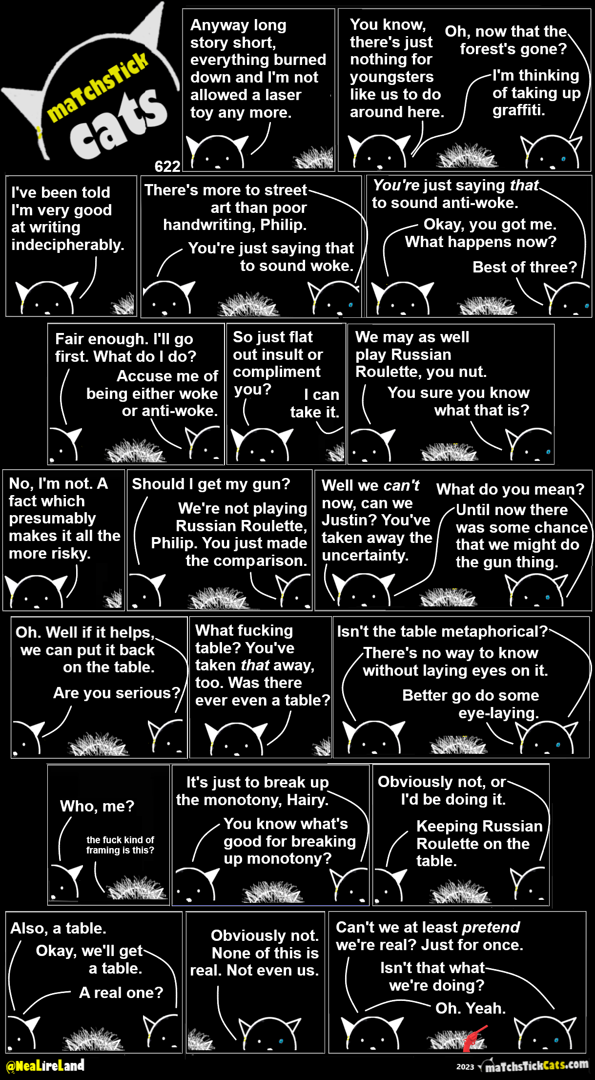 Matchstick Cats 622: Russian Roulette Table 22 May 202313 November 2024 Share this post: Click to share on Bluesky (Opens in new window) Bluesky Click to share on Threads (Opens in new window) Threads Click to share on X (Opens in new window) X Click to share on Mastodon (Opens in new window) Mastodon Click to share on Facebook (Opens in new window) Facebook Click to share on LinkedIn (Opens in new window) LinkedIn Click to share on Tumblr (Opens in new window) Tumblr Click to share on Reddit (Opens in new window) Reddit Click to share on Pinterest (Opens in new window) Pinterest Click to share on WhatsApp (Opens in new window) WhatsApp Click to share on Pocket (Opens in new window) Pocket