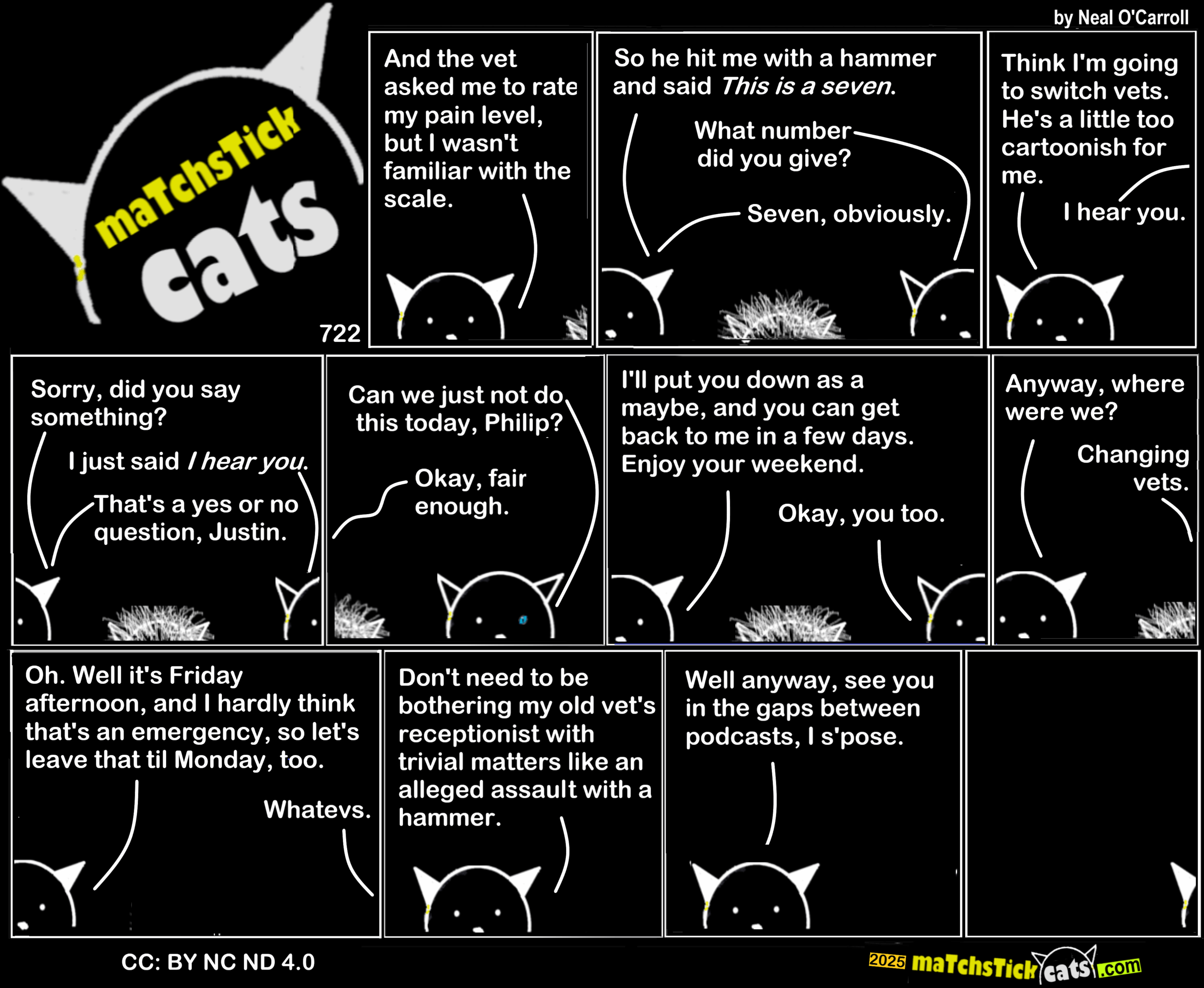 Matchstick Cats 722: Pain 7 November 20258 November 2025 More Cats | All Episodes | Creative Commons | If you like swiping through comics in carousel form, try this page on Archive.org. < Share this post: Click to share on Bluesky (Opens in new window) Bluesky Click to share on Threads (Opens in new window) Threads Click to share on X (Opens in new window) X Click to share on Mastodon (Opens in new window) Mastodon Click to share on Facebook (Opens in new window) Facebook Click to share on LinkedIn (Opens in new window) LinkedIn Click to share on Tumblr (Opens in new window) Tumblr Click to share on Reddit (Opens in new window) Reddit Click to share on Pinterest (Opens in new window) Pinterest Click to share on WhatsApp (Opens in new window) WhatsApp Click to share on Pocket (Opens in new window) Pocket Related Catsegory