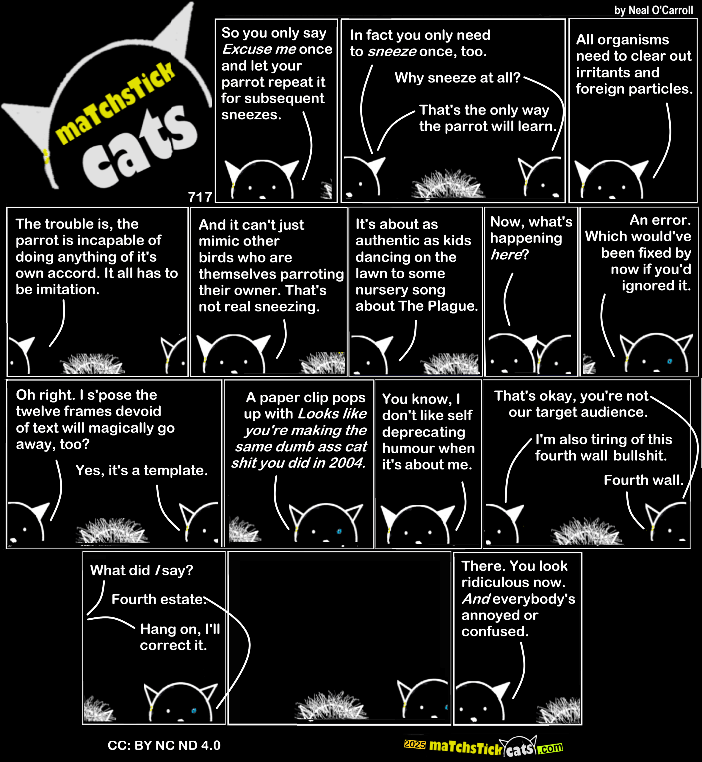 Matchstick Cats 717: Why Sneeze at All? 20 October 202520 October 2025 Share this post: Click to share on Bluesky (Opens in new window) Bluesky Click to share on Threads (Opens in new window) Threads Click to share on X (Opens in new window) X Click to share on Mastodon (Opens in new window) Mastodon Click to share on Facebook (Opens in new window) Facebook Click to share on LinkedIn (Opens in new window) LinkedIn Click to share on Tumblr (Opens in new window) Tumblr Click to share on Reddit (Opens in new window) Reddit Click to share on Pinterest (Opens in new window) Pinterest Click to share on WhatsApp (Opens in new window) WhatsApp Click to share on Pocket (Opens in new window) Pocket