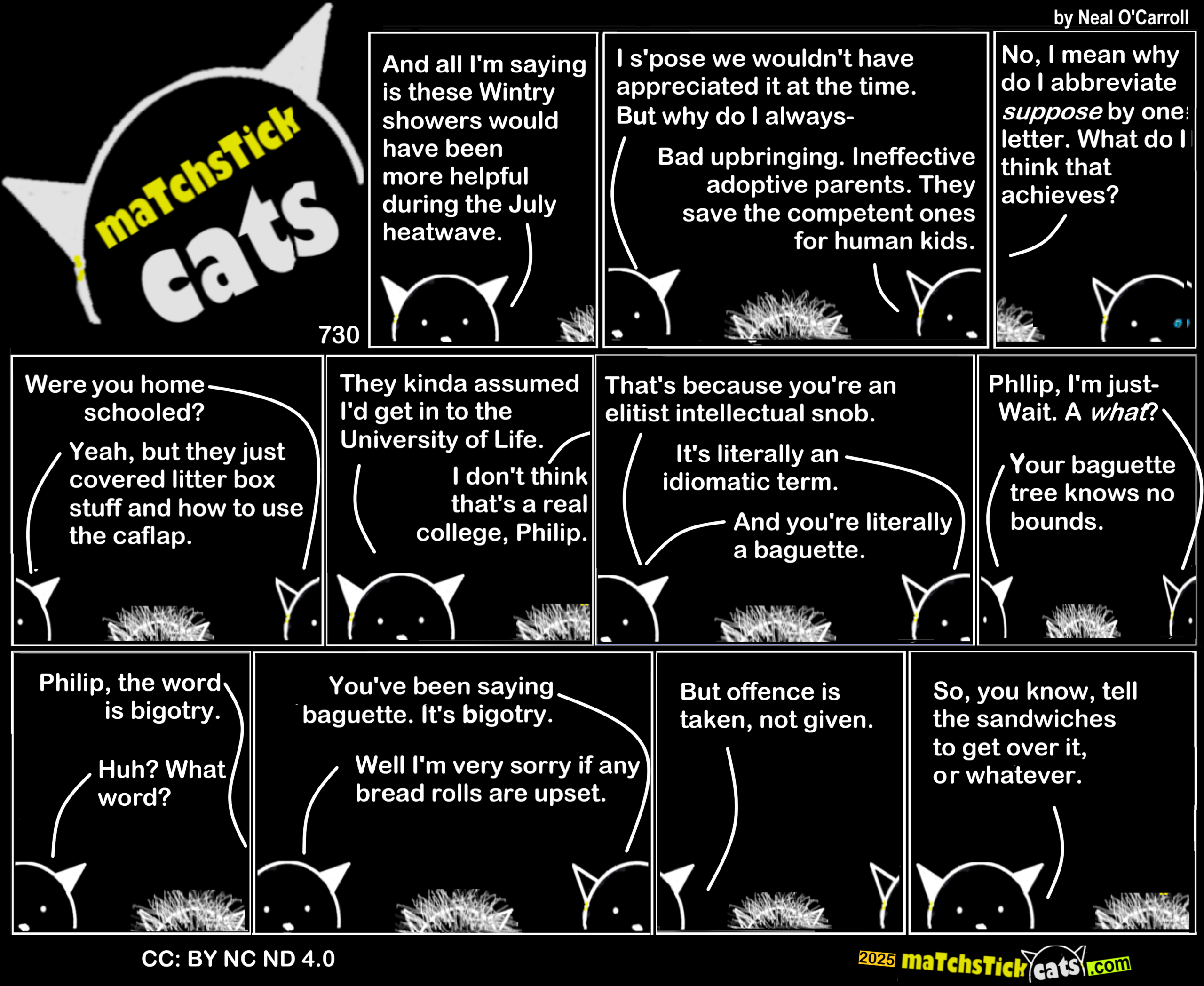 Matchstick Cats 730: The Idiomat 23 November 202517 January 2026 Share this post: Click to share on Bluesky (Opens in new window) Bluesky Click to share on Threads (Opens in new window) Threads Click to share on X (Opens in new window) X Click to share on Mastodon (Opens in new window) Mastodon Click to share on Facebook (Opens in new window) Facebook Click to share on LinkedIn (Opens in new window) LinkedIn Click to share on Tumblr (Opens in new window) Tumblr Click to share on Reddit (Opens in new window) Reddit Click to share on Pinterest (Opens in new window) Pinterest Click to share on WhatsApp (Opens in new window) WhatsApp Click to share on Pocket (Opens in new window) Pocket